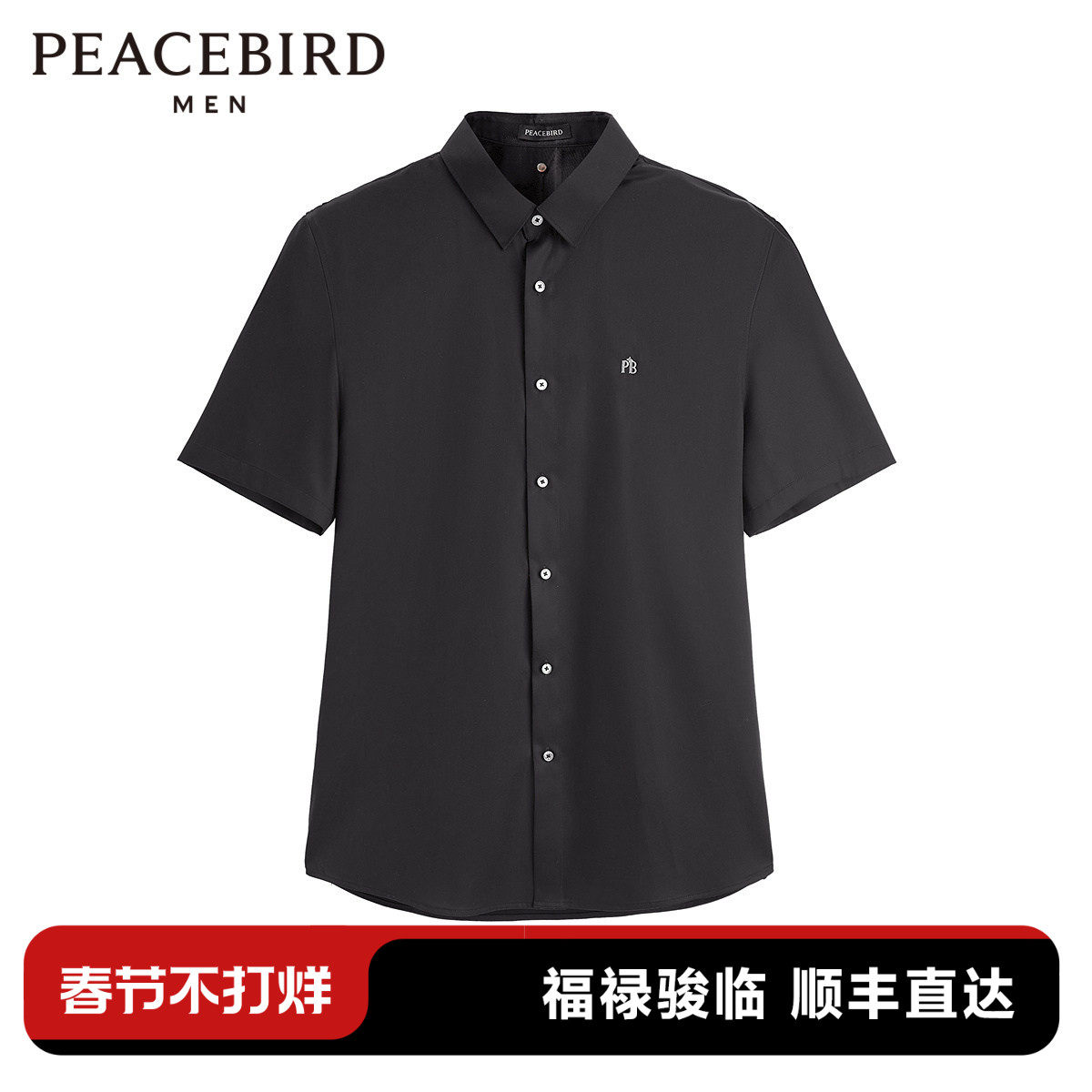 太平鸟男装 纯色短袖衬衫夏季撞色字母刺绣黑色修身商务休闲衬衣