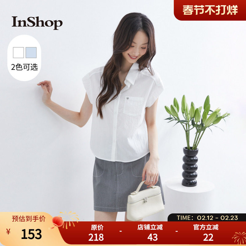 InShop【商场同款】新款简洁纯色短袖衬衫女休闲弧形底摆翻领上衣