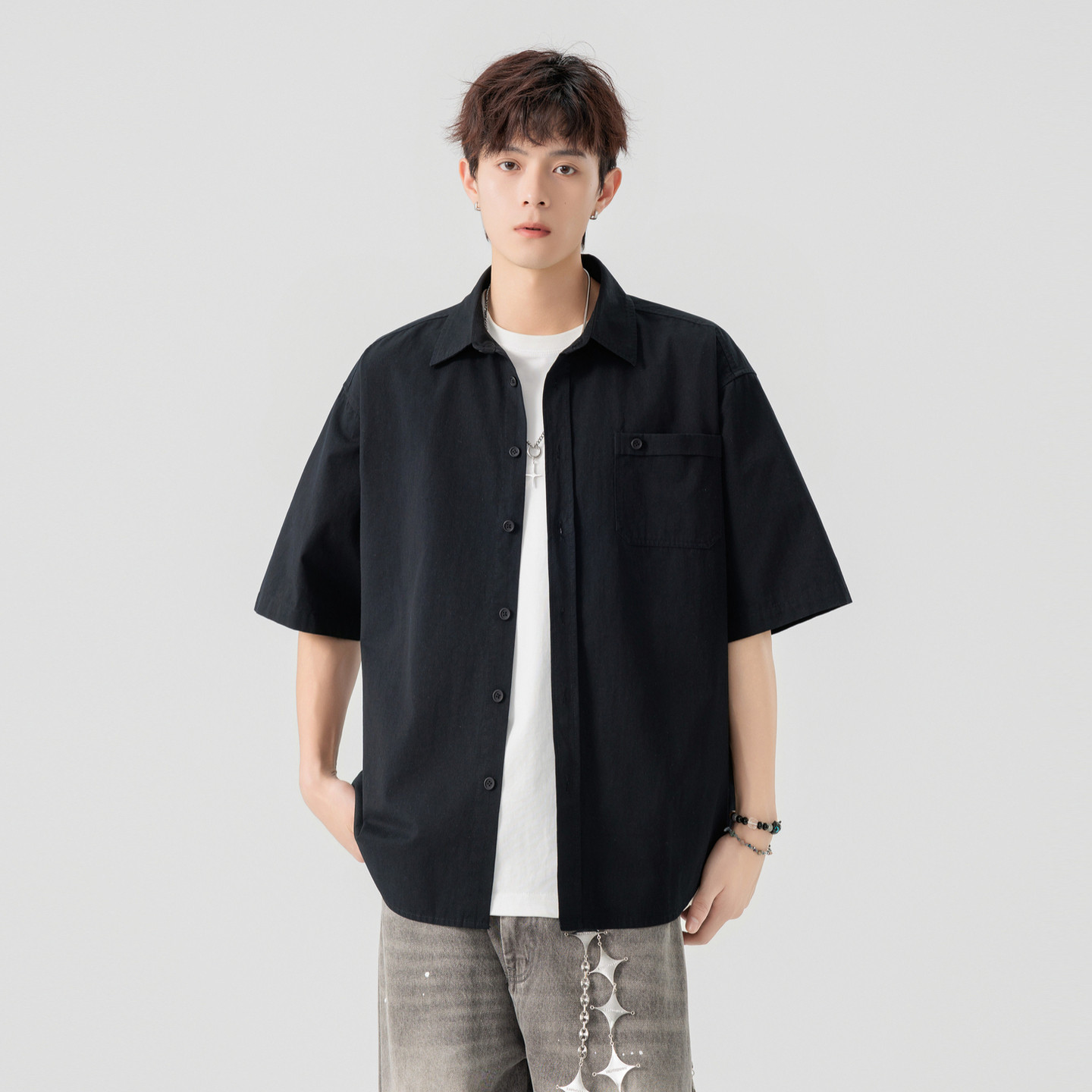 2025夏季男士青少年纯色短袖衬衫加大码潮流帅气半袖衬衣宽松上衣