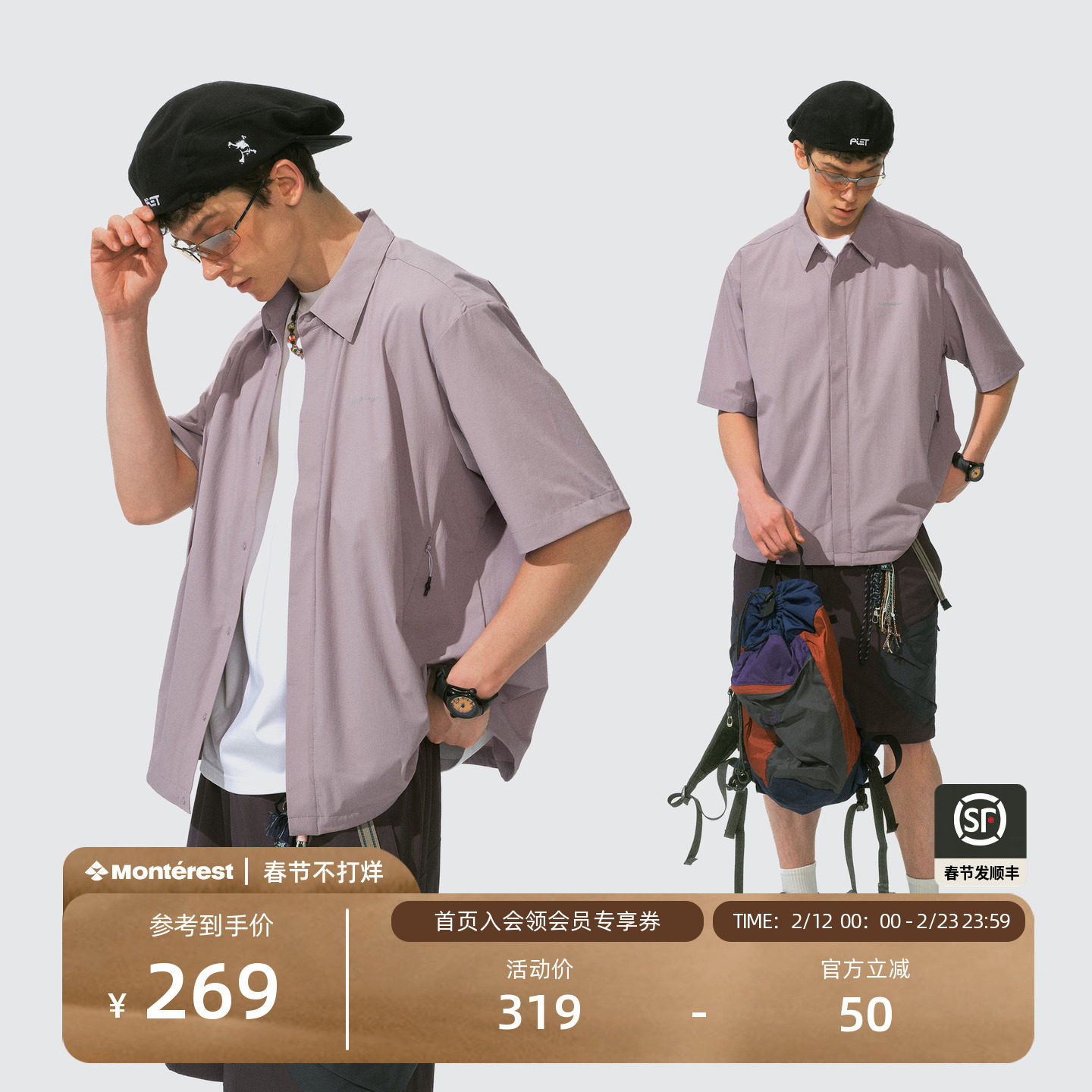 瞬时山野Monterest山系户外弧线分割叠穿外套基础纯色短袖衬衫男