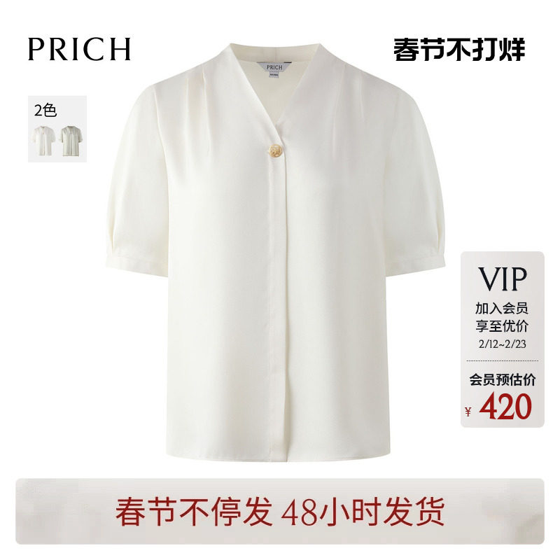 PRICH法式泡泡袖淡人V领纯色短袖衬衫夏季新款优雅气质上衣女