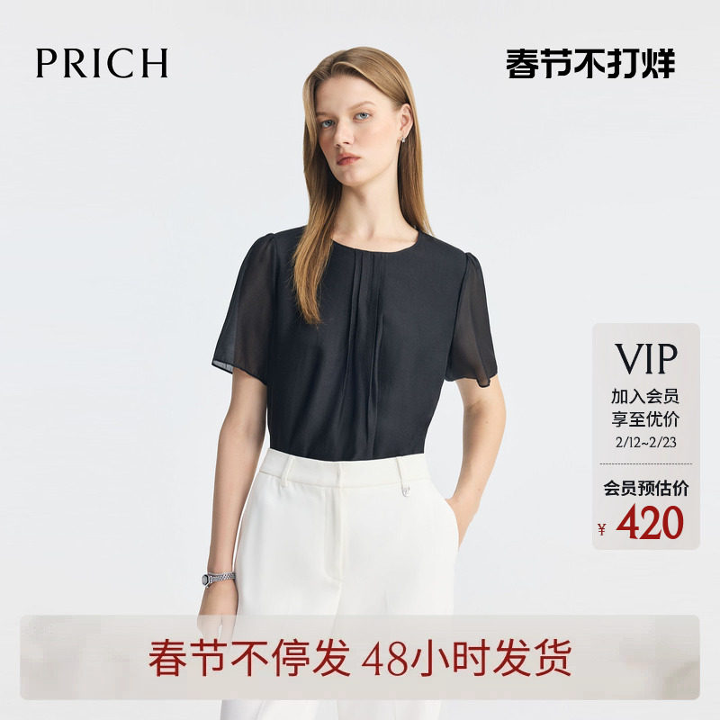 PRICH简约灵动飘带领纯色短袖衬衫2026春季新款垂坠气质上衣女