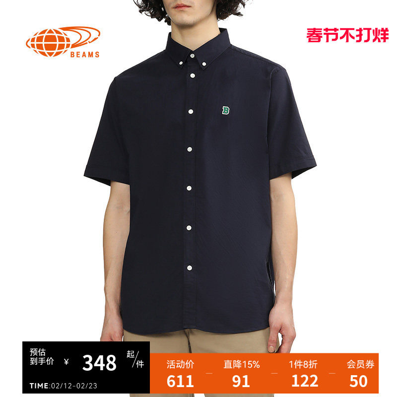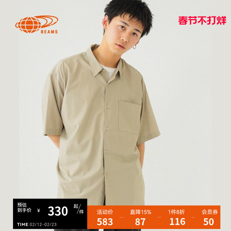BEAMS男装纯色短袖衬衫2023夏季新品通勤翻领直排扣衬衣010124XK