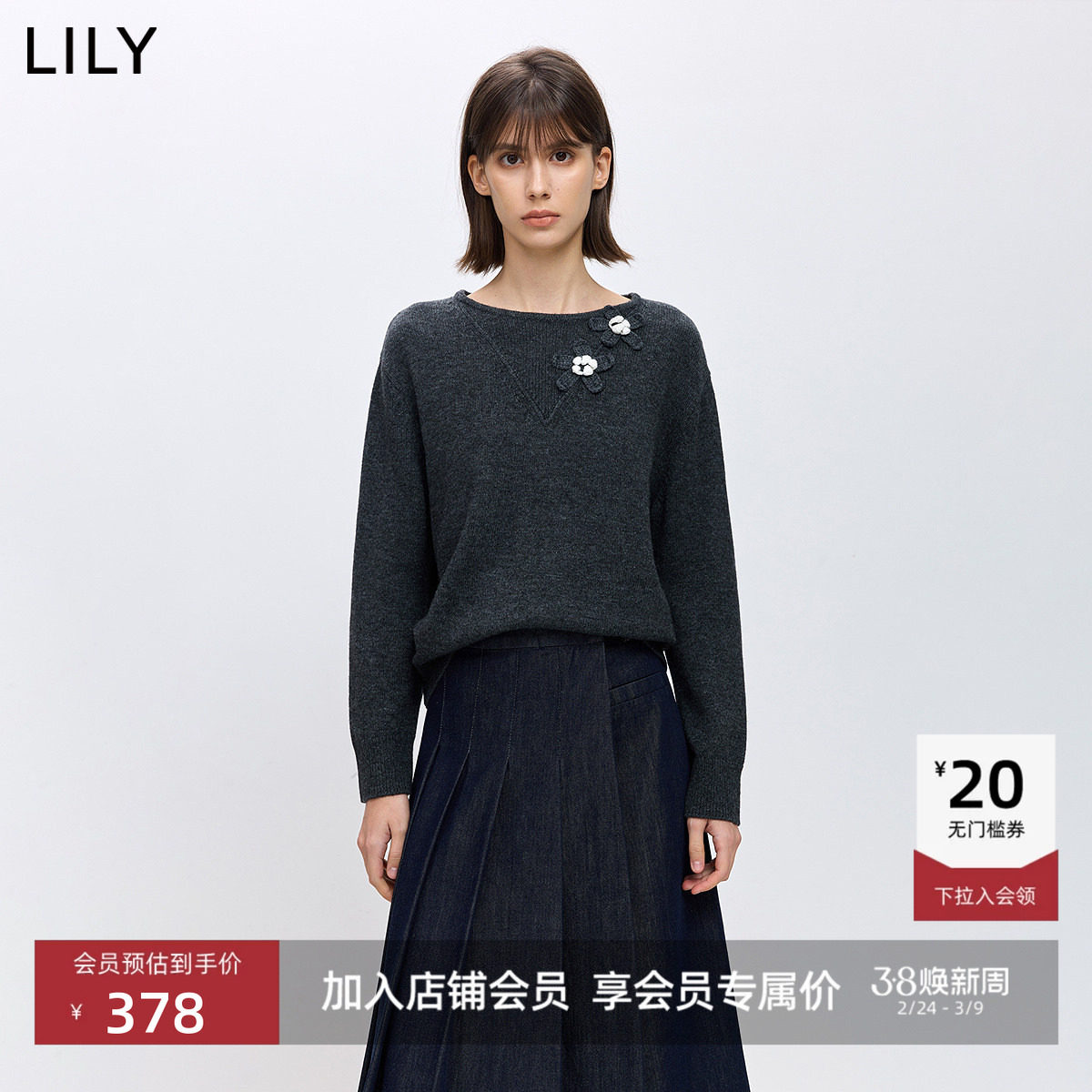 LILY2025冬新款女装羊毛混纺软糯生肖马亮钻链条绣加厚针织衫毛衣