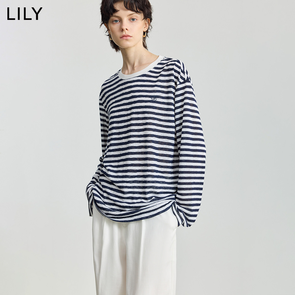 LILY2025冬新款简约撞色条纹圆领宽松休闲百搭通勤长袖T恤女上衣