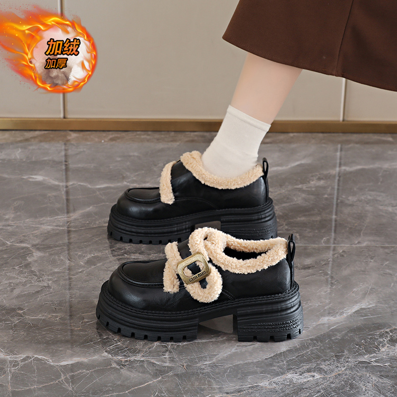 赵露思同款加绒乐福鞋女冬季粗跟厚底黑色英伦风小皮鞋保暖棉鞋子