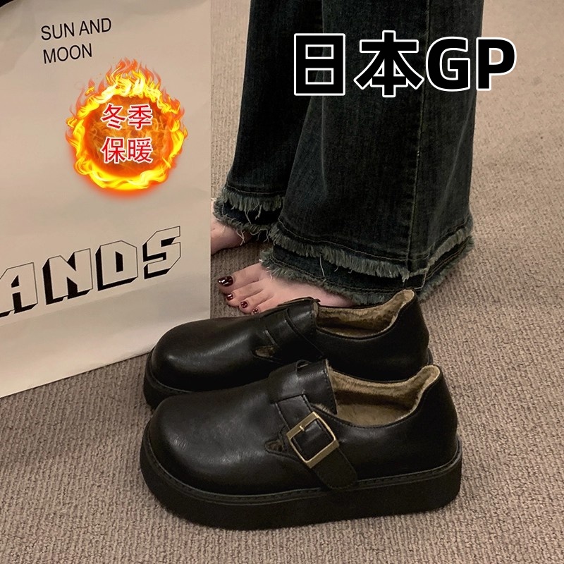 【王小毒】暖冬甜心●毛绒厚底乐福鞋女冬季一字扣加绒毛毛小皮鞋
