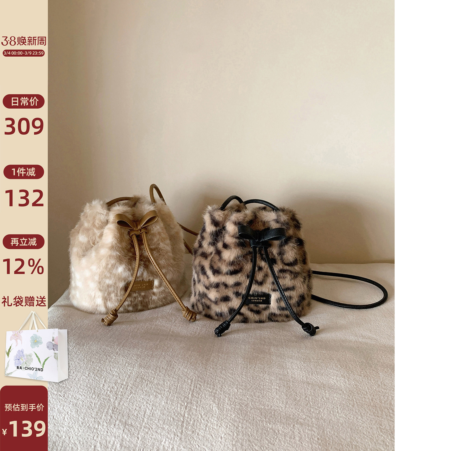 南风Chio2nd 丝绒晚宴水桶包包女秋冬洋气豹纹毛绒包单肩斜挎小包