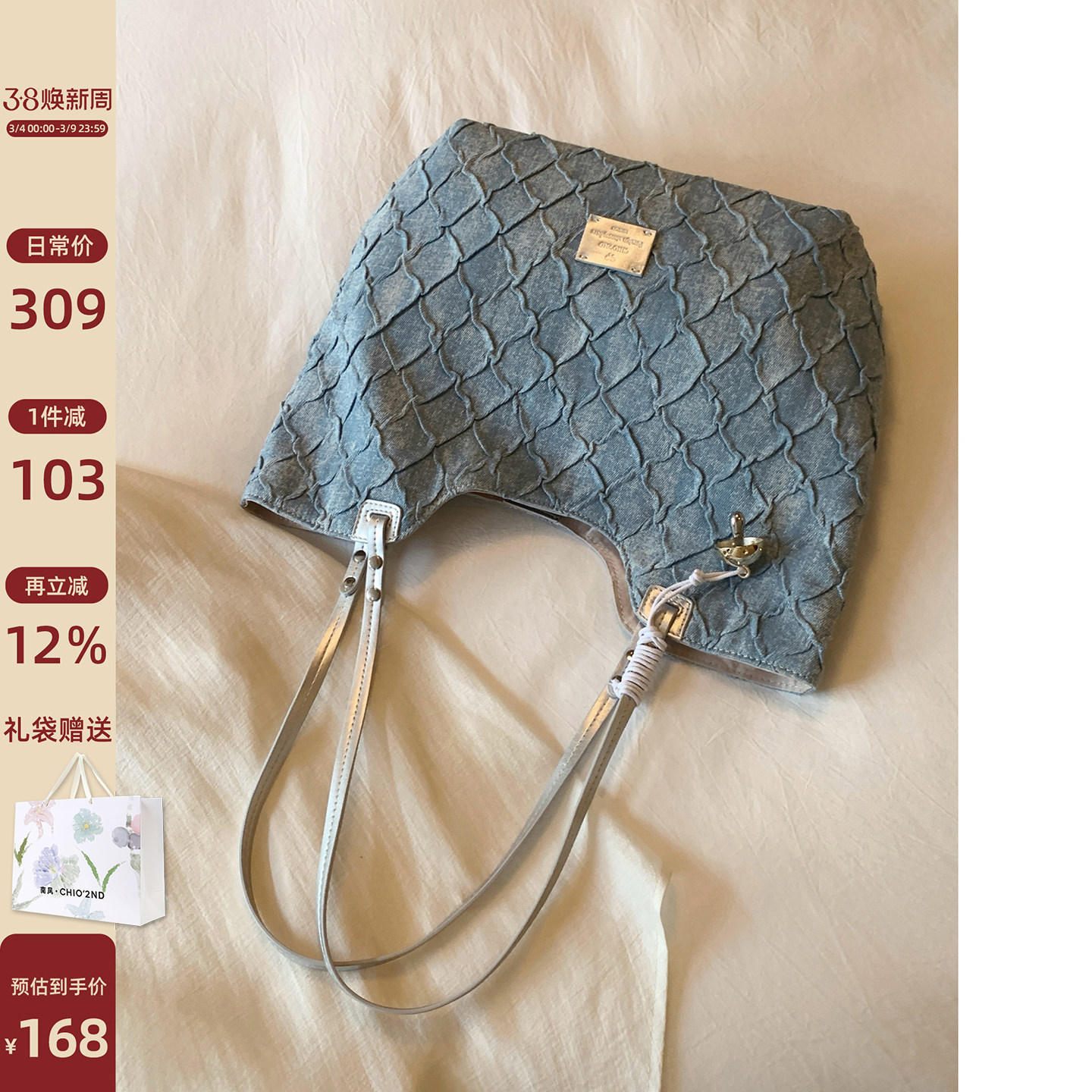 南风Chio2nd 浅草絮语托特包包女秋冬上班通勤包牛仔蓝手提单肩包