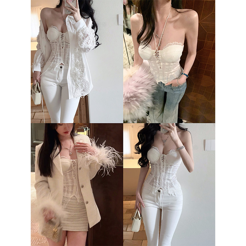 白色低领蕾丝设计吊带连衣裙女夏季收腰气质女神范高级感包臀短裙