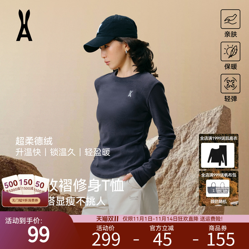 安欧兔AOT德绒收褶修身T恤女 柔软舒适百搭上衣保暖内衣长袖内搭