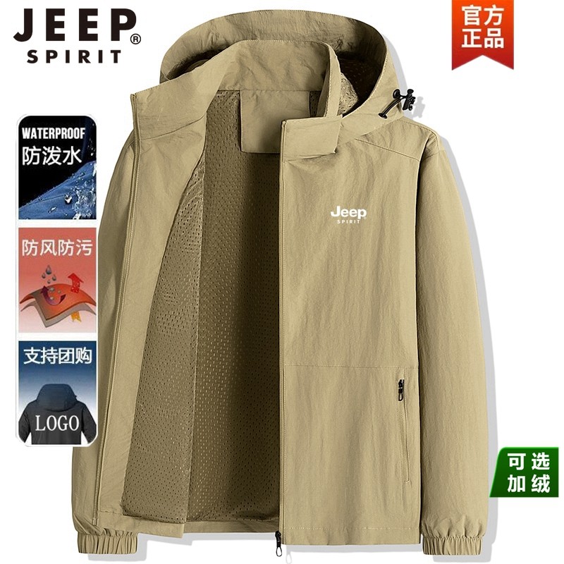 吉普JEEP夹克男外套春秋轻薄加绒防风棉服连帽透气冲锋男上衣