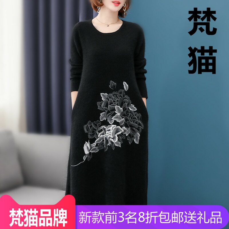 狐狸绒针织毛衣裙女宽松中长款中国民族风刺绣半高领长袖打底裙子