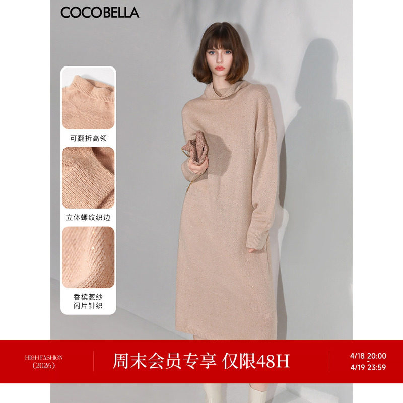 COCOBELLA温柔粉金葱亮片针织连衣裙女中长款高领毛衣裙FR3066