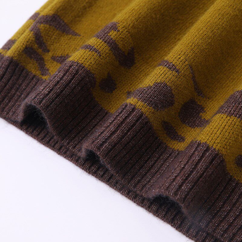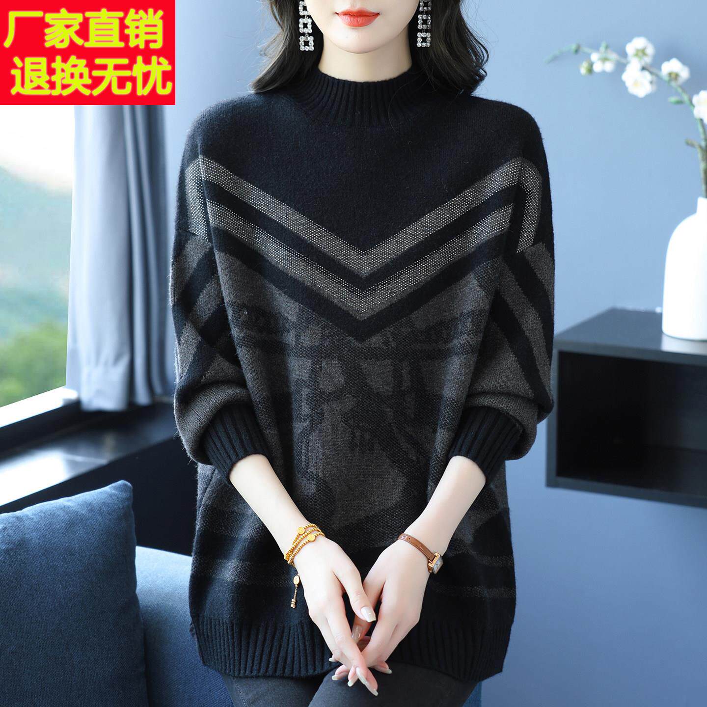 中长款民族风拼色印花针织衫女2024秋冬新款宽松半高领毛衣妈妈装