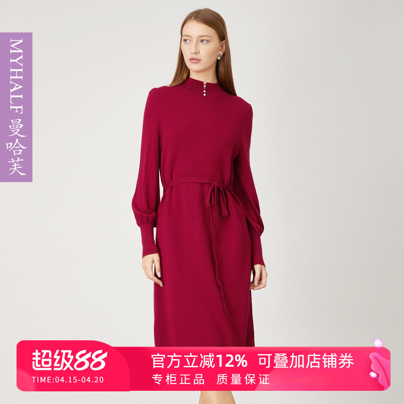 曼哈芙针织羊毛连衣裙女秋冬半高领显瘦系带收腰百搭中长款毛衣裙