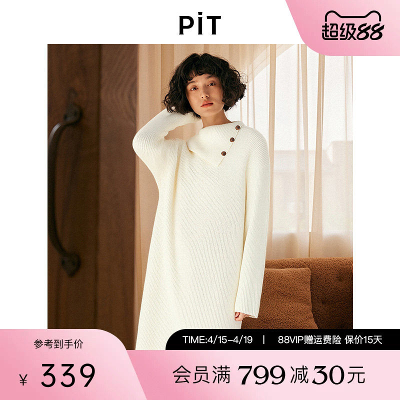 PIT复古米白色长款毛针织连衣裙2026春季新款毛衣裙高领百搭