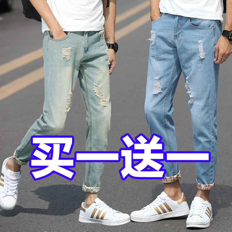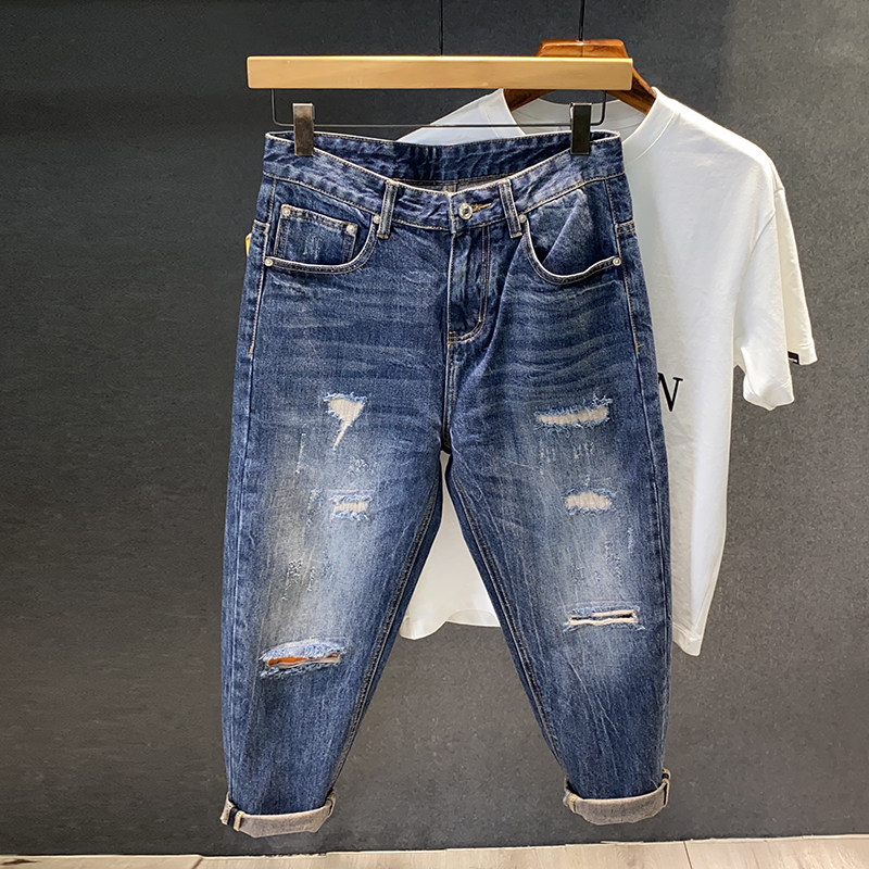 香港夏季八分九分小个子牛仔裤男宽松小脚薄款破洞9分休闲百搭裤