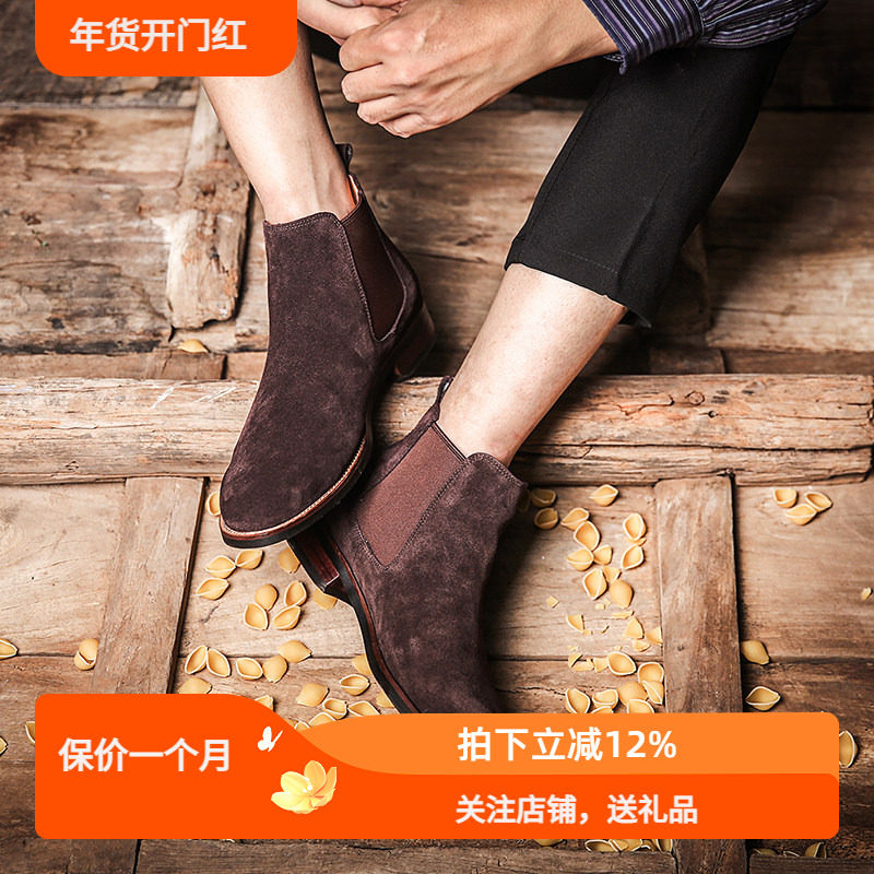 TRD英伦复古短靴高丝光反绒切尔西靴男潮圆头真皮手工鞋套脚男靴