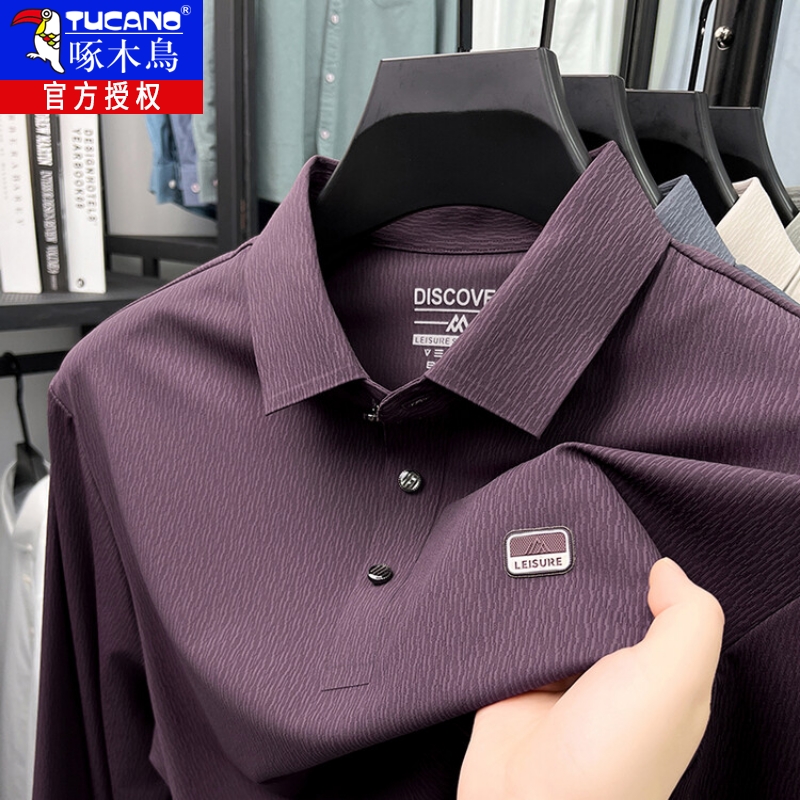 啄木鸟男士长袖polo衫翻领T恤无痕抗皱打底衫中年爸爸装纯色上衣