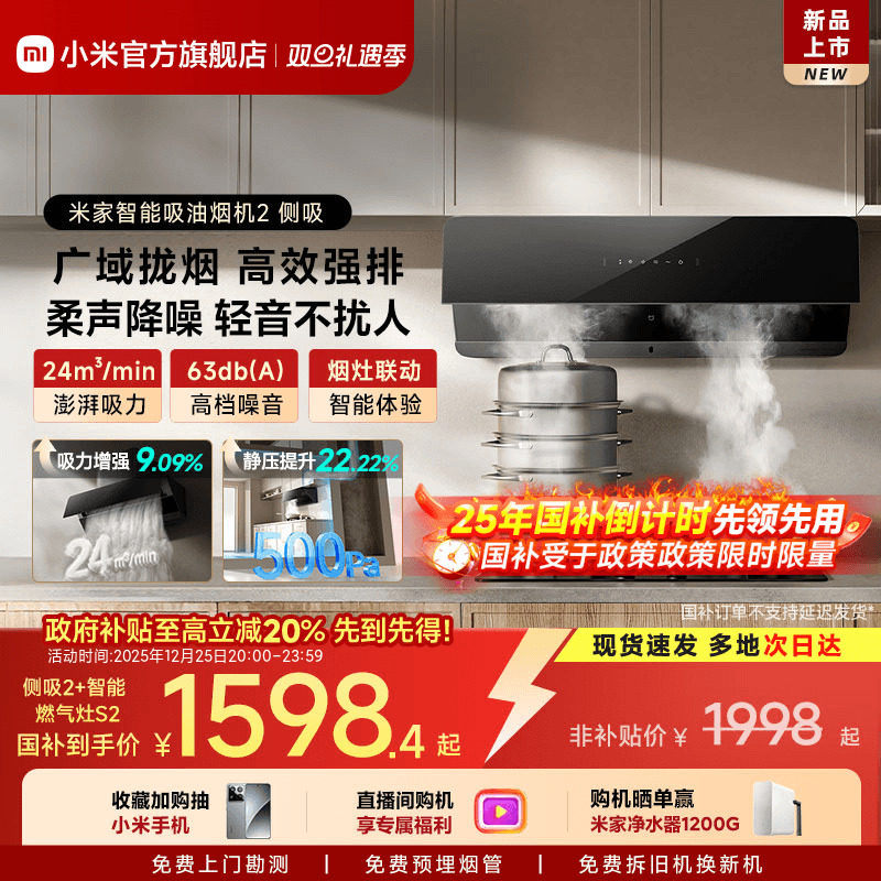 [新品]小米官方米家智能吸油烟机2侧吸抽油烟机燃气灶套装大吸力
