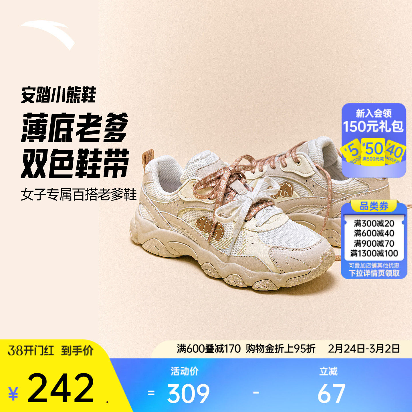 安踏小熊鞋丨薄底老爹鞋女休闲鞋春季潮流百搭软底舒适舞蹈运动鞋