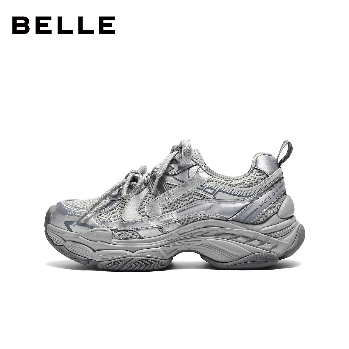 百丽网面银色厚底老爹鞋女2026春季商场新款增高休闲鞋F6H1DAM6