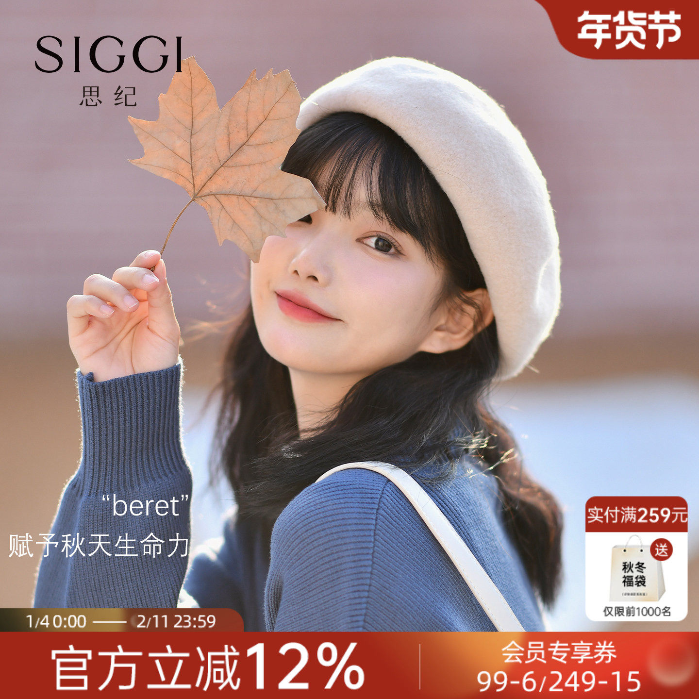 Siggi 帽子女贝雷帽秋冬羊毛画家帽洋气复古百搭蓓蕾大头围南瓜帽