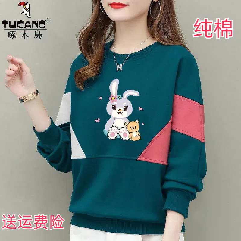 啄木鸟纯棉圆领长袖卫衣女2024秋冬季韩系中老年宽松拼接体恤衫女