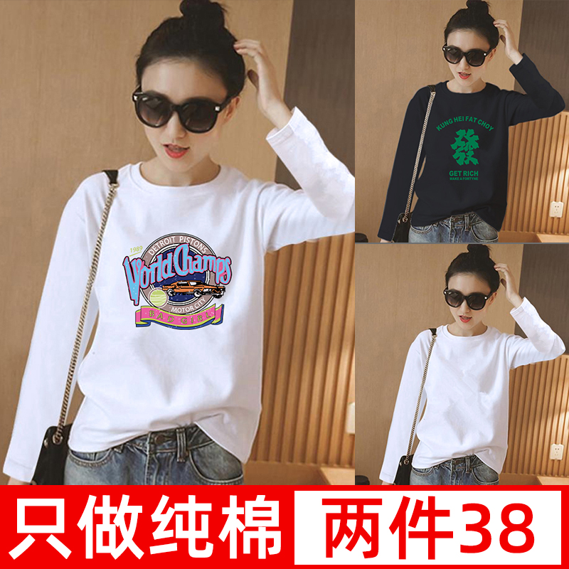 春秋纯棉长袖T恤女士印花上衣新款大码圆领体恤宽松内搭打底衫ins