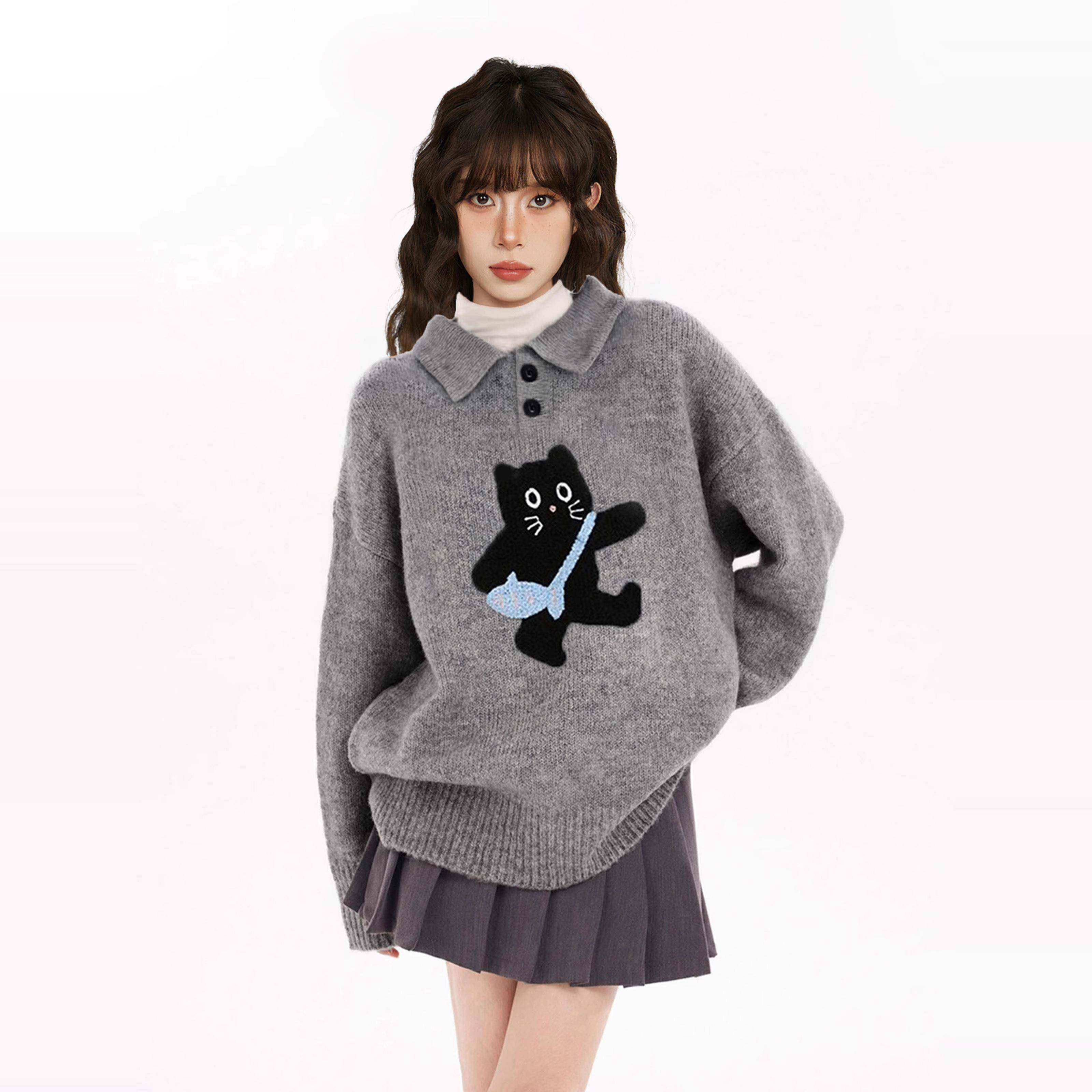 灰色POhyxf6e5fLO织翻领麦克风毛衣女秋冬加厚套宽松慵懒羊毛猫针