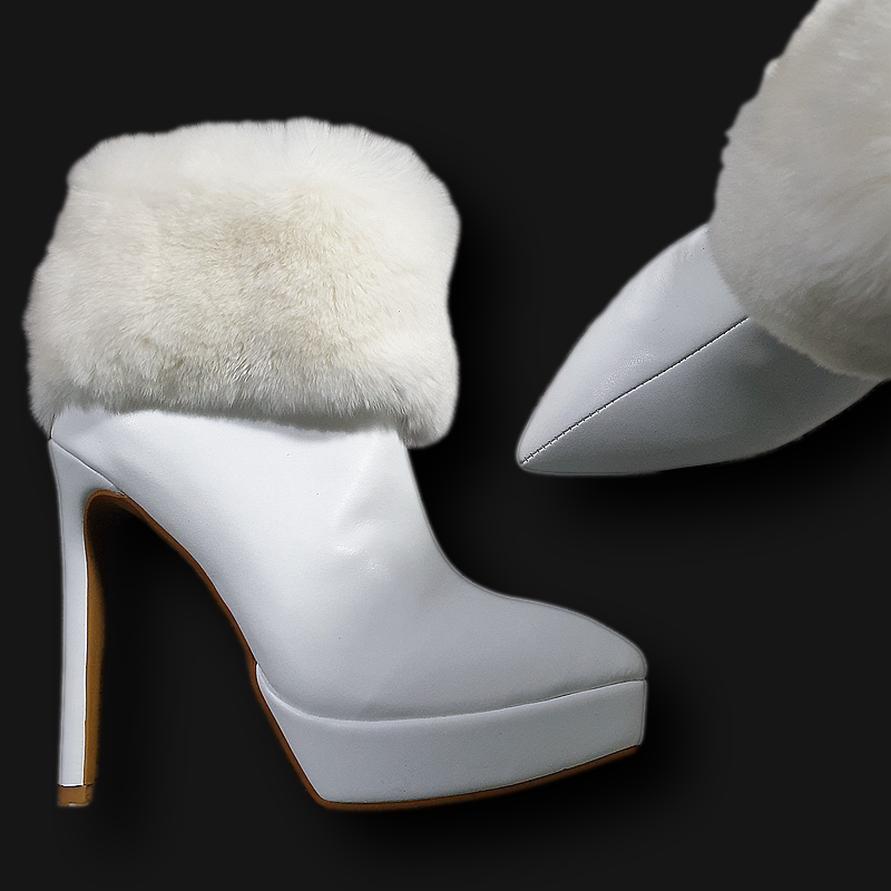 秋冬13CM超高跟细跟防水台兔毛短靴牛皮尖头靴子白色加绒厚底定制