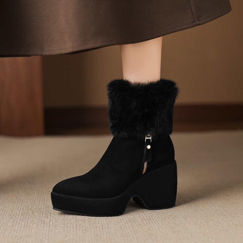 9cm高跟厚底兔毛领靴子冬季加绒时装短靴圆头头层羊皮女靴小个子