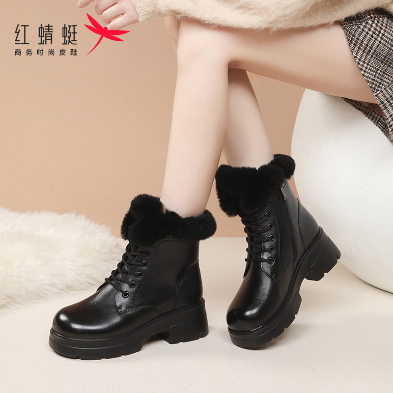 红蜻蜓官方正品2025新款女靴子头层牛皮马丁靴兔毛加绒保暖真皮超
