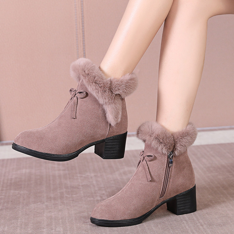真皮粗跟兔毛短靴女2025冬季新款磨砂皮雪地靴保暖加绒中跟棉靴子