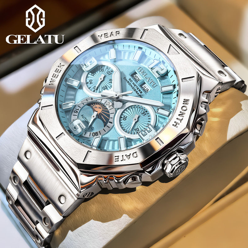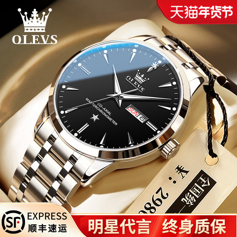 2025时尚全自动非机械石英表商新款夜光男士钢带腕表防水绿色日历