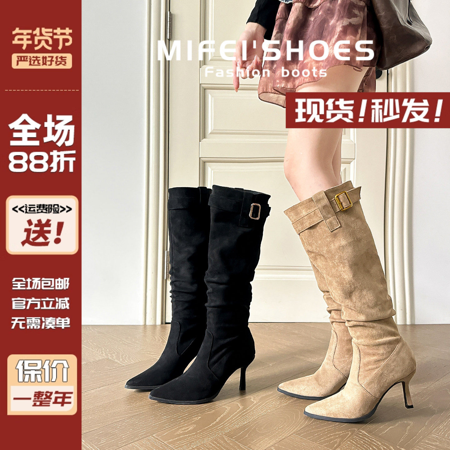 真皮~骄屿尖头细跟显瘦长靴女堆堆靴皮带扣褶皱高跟长筒靴瘦瘦靴