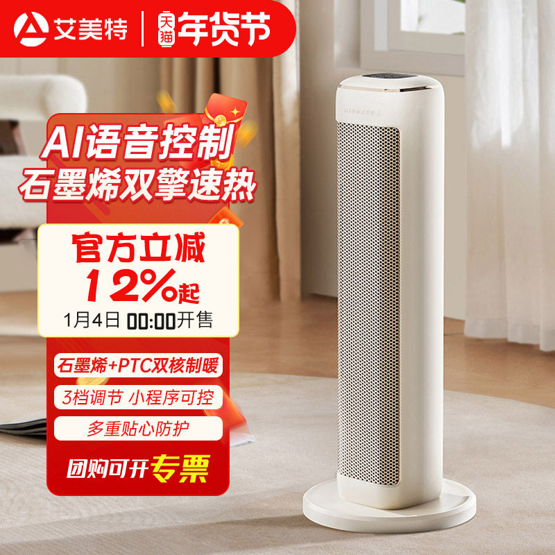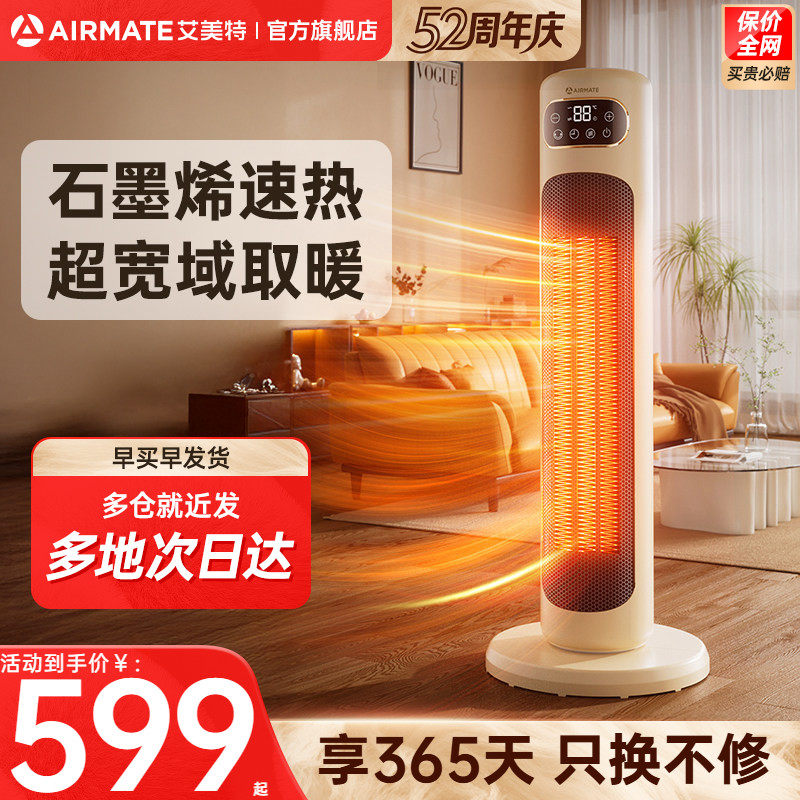 艾美特暖风机家用石墨烯取暖器节能省电立式办公室速热电暖器新款