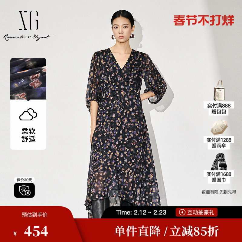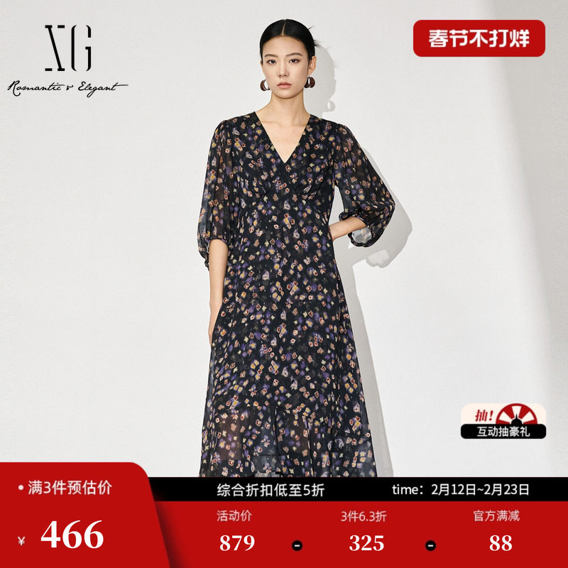 XG/雪歌XL304869A806七分袖连衣裙2025秋季新款高腰印花中长裙女