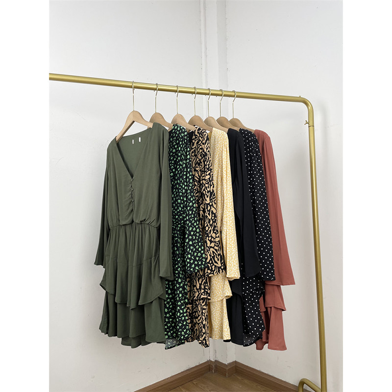 A3德国单外贸26秋新款女士七分袖碎花花色V领高腰中连衣裙蛋糕裙