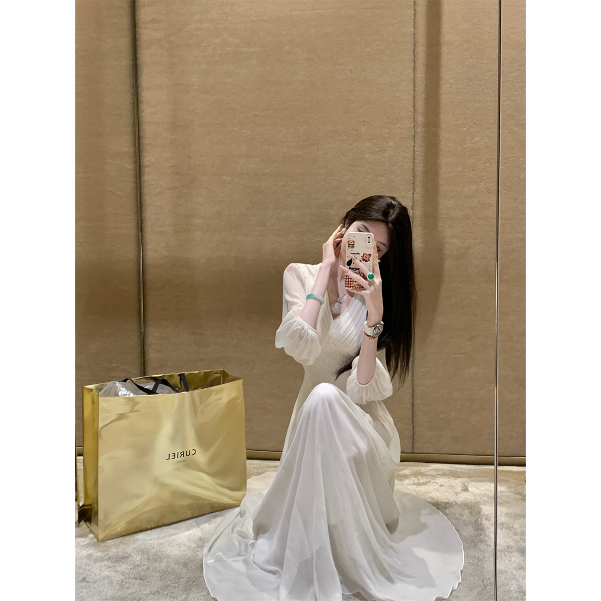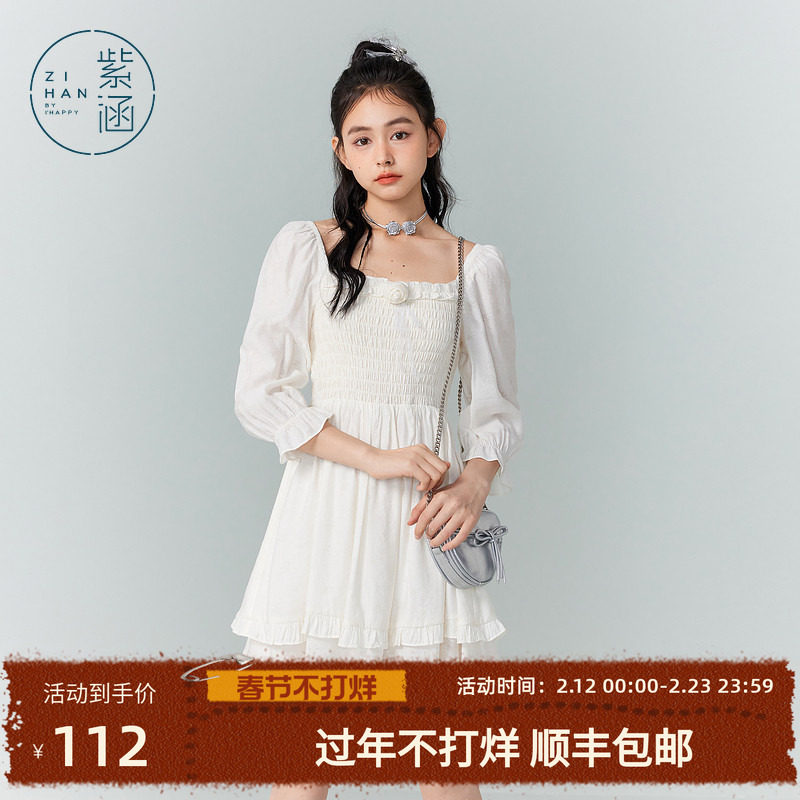 紫涵白色方领七分袖连衣裙女秋季新款法式甜美风休闲修身高腰短裙