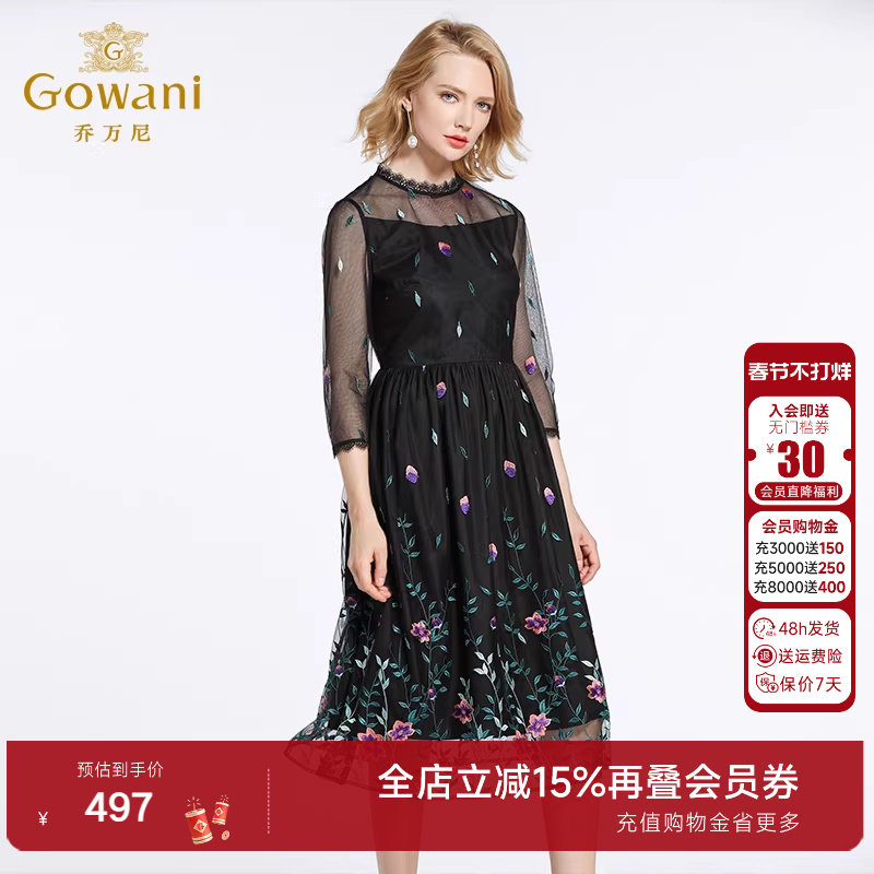 乔万尼秋装女商场新款修身高腰气质绣花网纱七分袖连衣裙中长韩版