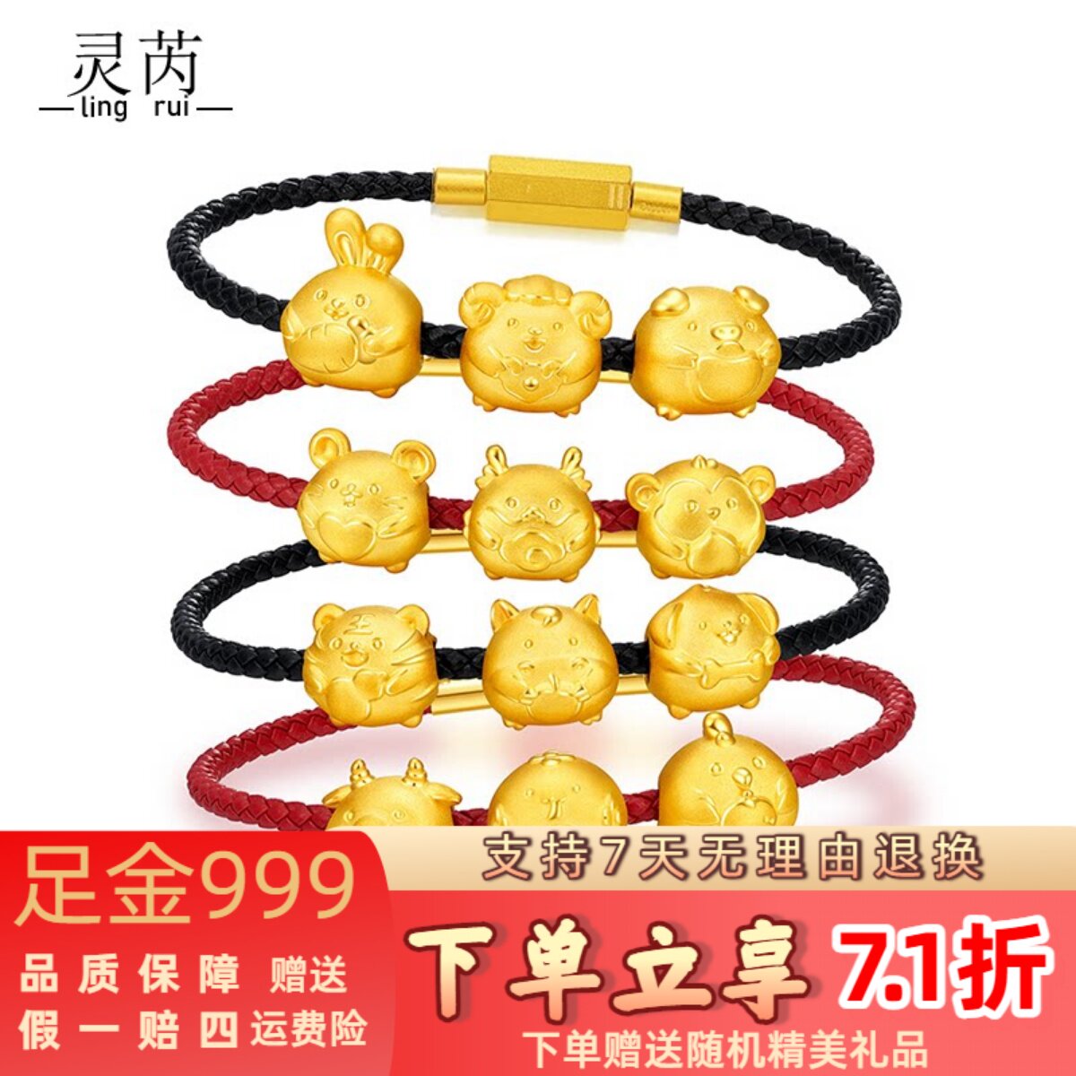 999黄金转运珠抱福手串红绳本命年十二生肖3D硬金足金龙鸡蛇手链