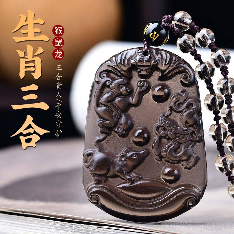 天然冰种黑曜石三合贵人十二生肖吊坠牌属兔龙蛇鸡鼠马狗项链转运