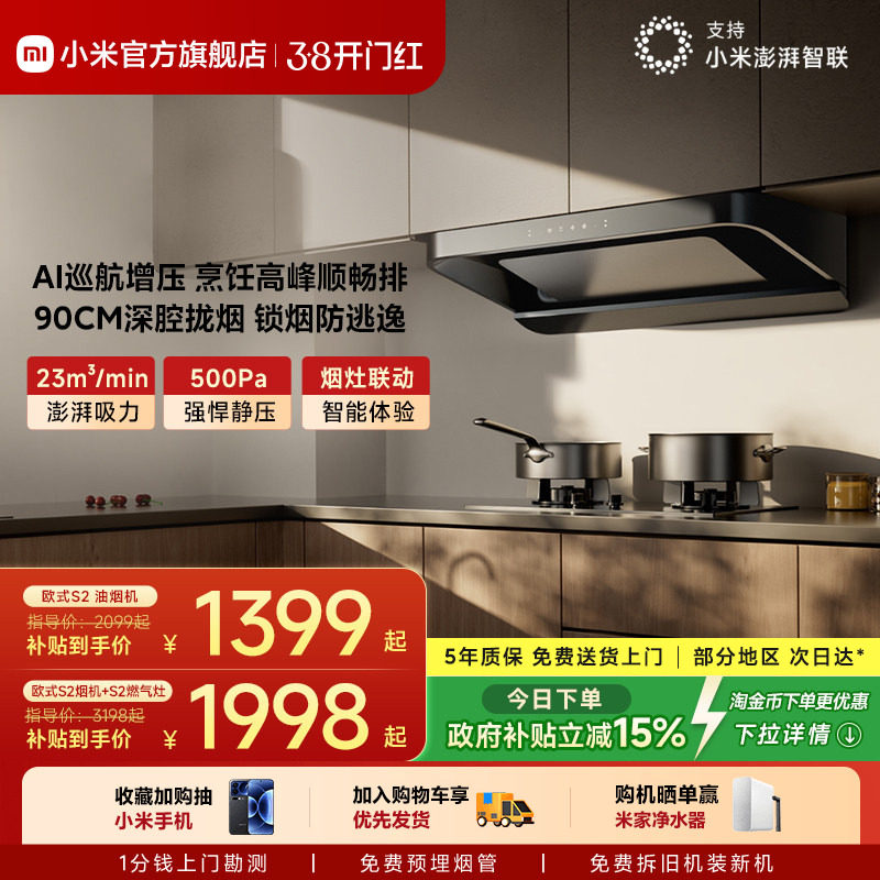 小米官方米家智能欧式S2厨房家用抽油烟机燃气灶套装正品大吸力