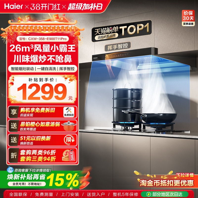 [26年新品]海尔抽油烟机燃气灶一套家用大吸力欧式烟灶套装T11Pro