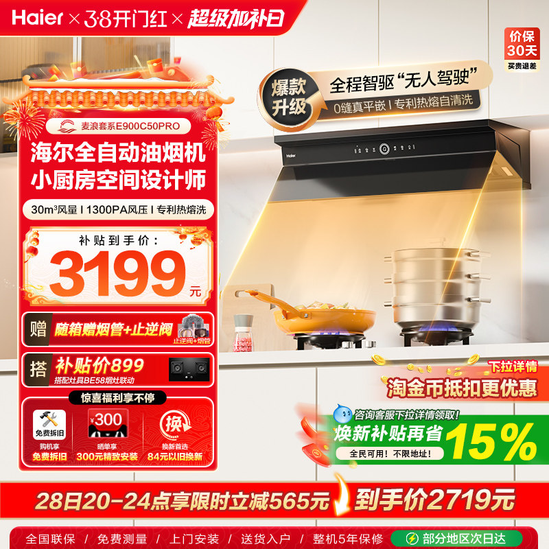 海尔麦浪全自动C50Pro吸抽油烟机燃气灶具套装家用烟灶套装