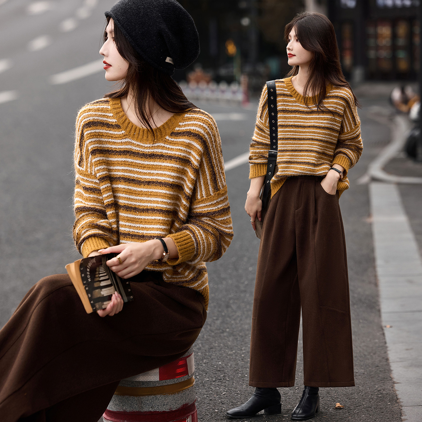 苏醒的乐园圆领条纹毛衣阔腿裤套装2025年冬季新款女装两件套装