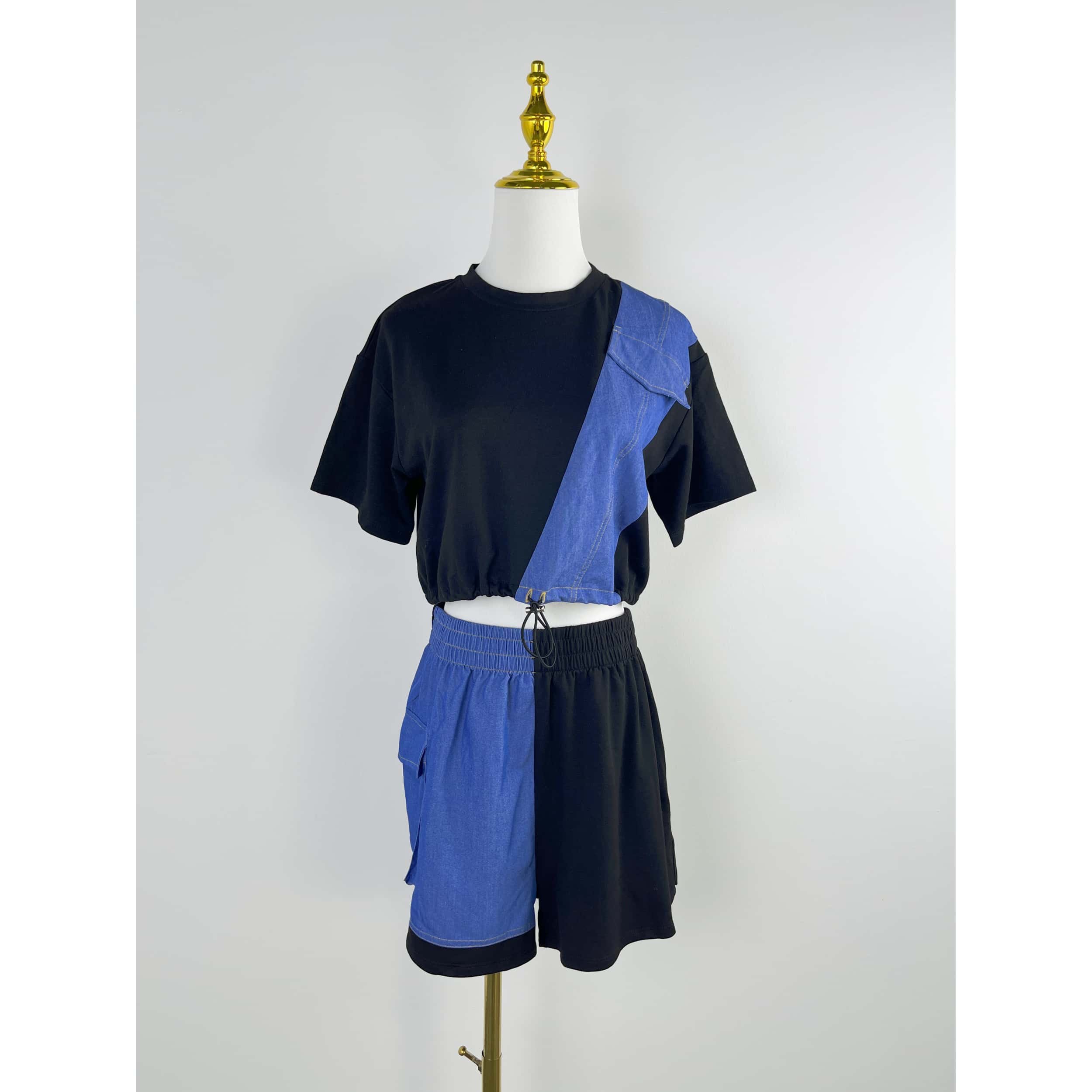 H3156外贸新款个性拼接短款休闲女装两件套短袖短裤夏季舒适套装
