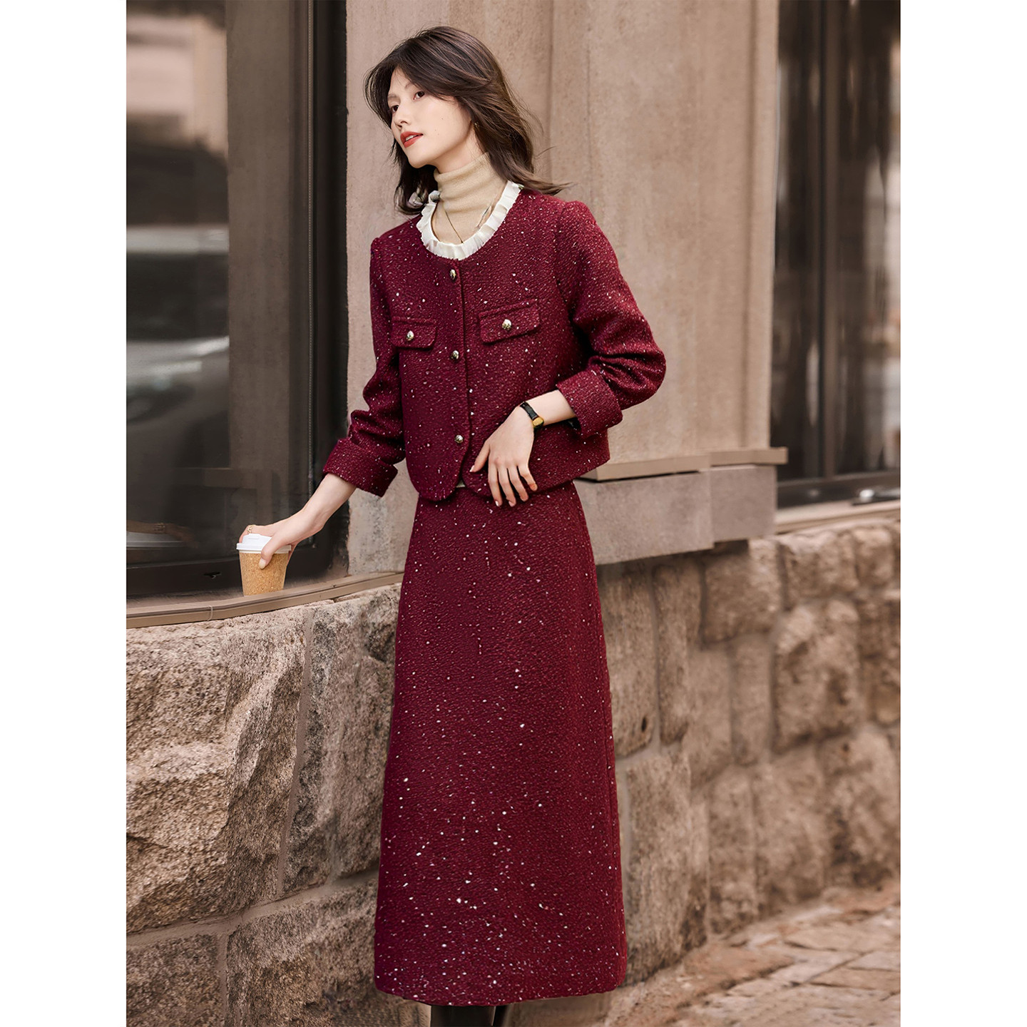 订婚红色小香风套装女秋冬季新款高级感气质名媛过年半身裙两件套